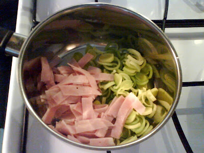 Pridáme do hrnca k póru a k šunkovej saláme.